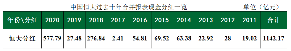過去十年(2011-2020),恒大集團(tuán)年年有分紅,合并報(bào)表范圍內(nèi)分紅的現(xiàn)金總支出超過1142億,每到分紅期,市場都會(huì)刮起恒大豪氣分紅的旋風(fēng)。