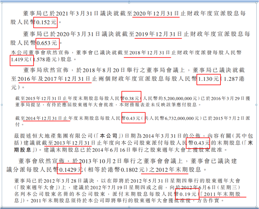 這是恒大集團(tuán)合并報(bào)表范圍內(nèi)分紅的現(xiàn)金總支出,與作為上市公司的中國恒大(HK:03333)的股東分紅有一定的區(qū)別。