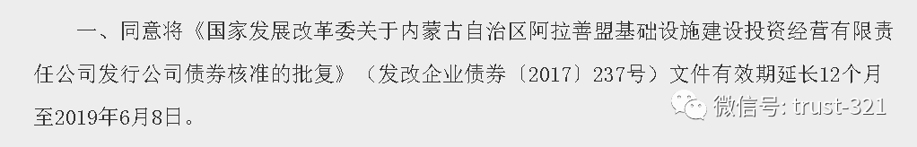 最后也是最關鍵的,連續發債失敗:2017年6月,國家發改委曾核準阿拉善盟基礎建設投資經營有限公司(項目融資方)發行17億公司債券:但由于種種原因,這個債券發行失敗了;2018年6月,該公司向發改委申請批復有效期延長一年,至2019年6月,并獲得發改委許可: