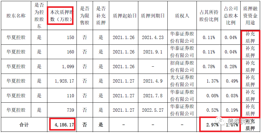 1月29日,華夏幸福公告,公司的控股股東華夏幸福基業(yè)控股股份公司及其一致行動人新增質(zhì)押4,186.17萬股,占其所持股份比例為2.97%,用途為補(bǔ)充質(zhì)押,質(zhì)權(quán)人為華泰證券、招商證券和光大證券等證券公司。華夏幸福控股股東此次補(bǔ)充質(zhì)押股票,是為其前期質(zhì)押融資業(yè)務(wù)進(jìn)行的補(bǔ)充質(zhì)押。直接原因可能是華夏幸福近期的二級市場股價的下降。
