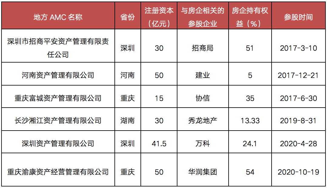 在此背景下,房企爭相參股地方資產(chǎn)管理公司(AMC),承接、處置不良資產(chǎn)的資產(chǎn)管理,萬科、華潤、招商、建業(yè)、協(xié)信等大型規(guī)模房企紛紛入局。