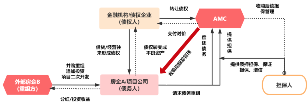房企與AMC合作最主流的合作模式是“不良資產(chǎn)處置、重組、再開發(fā)”模式。AMC負責(zé)不良資產(chǎn)的處置和重組,房企作為重組方負責(zé)再開發(fā)和運營。