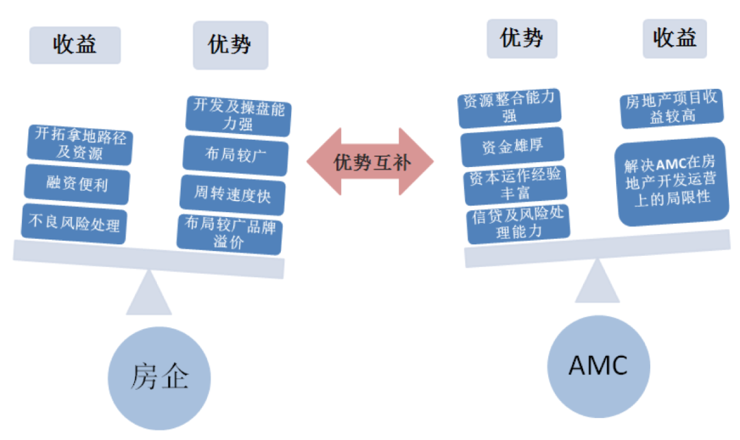 而AMC則可以借助房企進行項目開發(fā),化解自行開發(fā)的局限性,或者在為房企進行融資服務(wù)的過程中,獲取利息收益。