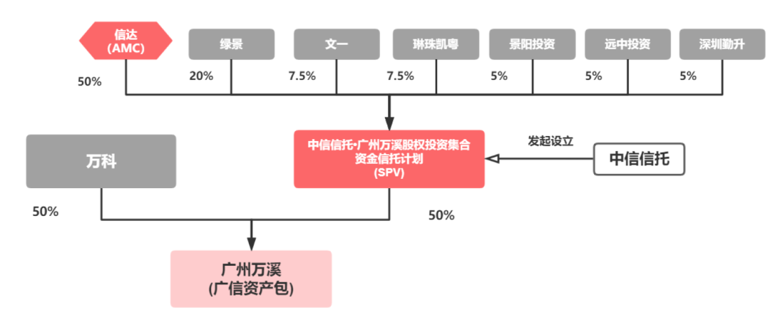 2020年6月萬科發(fā)布《關(guān)于廣信資產(chǎn)包引入戰(zhàn)略合作的公告》,采用“股權(quán)+債權(quán)”的交易方式,將廣信資產(chǎn)包以8.33折(390.4/470.4)出讓50%的權(quán)益予以信達在內(nèi)的七位戰(zhàn)投,整體回籠資金390.4億元。交易完成后,萬科和綠景負責(zé)廣信資產(chǎn)包的整理與開發(fā),其他五位戰(zhàn)投充當(dāng)財務(wù)投資者。而信達收購廣信資產(chǎn)包25%的權(quán)益,將進行債務(wù)重組、追加投資來盤活不良資產(chǎn),同時作為戰(zhàn)投提供資金的同時,能按照股權(quán)比例獲得相應(yīng)的經(jīng)營收益。