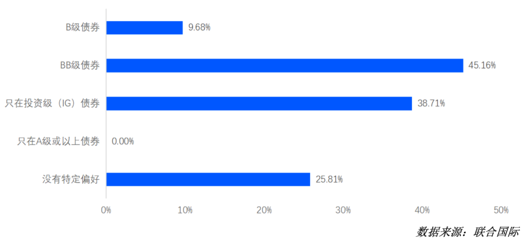 在未來(lái)12個(gè)月內(nèi),少于10%的受訪者會(huì)考慮投資B級(jí)債券。45.2%的受訪者考慮投資BB級(jí)債券,同時(shí)38.7%的受訪者只考慮投資級(jí)(IG)債券。有25.8%的受訪者在未來(lái)12個(gè)月內(nèi)沒(méi)有特定偏好(見(jiàn)附表2)。