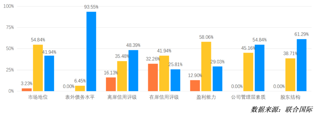 對(duì)于投資者在投資房地產(chǎn)債券時(shí)會(huì)考慮的因素方面,大部分的受訪者最關(guān)注發(fā)行人的公司治理情況、財(cái)務(wù)政策、政府政策、政府支持程度、住房市場(chǎng)需求、發(fā)行人的杠桿率、表外債務(wù)水平、離岸信用評(píng)級(jí)、公司管理層素質(zhì)和股東結(jié)構(gòu)。而大多數(shù)受訪者表示發(fā)行人公司的業(yè)務(wù)多樣性、市場(chǎng)地位、在岸信用評(píng)級(jí)和盈利能力屬于一般考慮因素。一位受訪者提到,發(fā)行人公司的是否上市也是一個(gè)考慮因素(見(jiàn)附表10)。