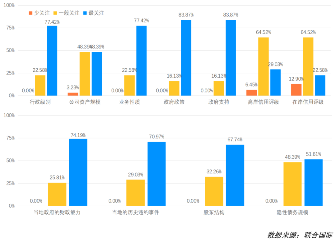 對(duì)于投資者在投資城投債券時(shí)會(huì)考慮的因素方面,大部分的受訪者最關(guān)注發(fā)行人的行政級(jí)別、業(yè)務(wù)性質(zhì)、政府政策、政府支持程度、當(dāng)?shù)卣呢?cái)政能力、當(dāng)?shù)氐臍v史違約事件、股東結(jié)構(gòu)和隱性債務(wù)規(guī)模。關(guān)于城投發(fā)行人的公司資產(chǎn)規(guī)模,約半數(shù)受訪者表示最為關(guān)注,約半數(shù)受訪者持一般態(tài)度。他們中許多人對(duì)離岸和在岸信用評(píng)級(jí)持中立態(tài)度(見(jiàn)附表11)。