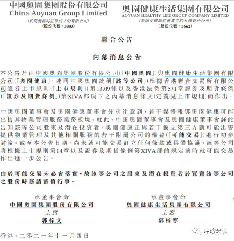 1、2021年11月3日,有媒體報道稱,為緩解流動性壓力,中國奧園擬出售旗下物業公司奧園健康控股股權,已接觸合生創展等多個買家,并希望11月底前能夠完成。2021年11月4日,中國奧園、奧園健康聯合發布公告稱“奧園健康正與若干獨立第三方就可能出售提供物業管理及其他相關服務的若干附屬公司的權益進行初步討論,截至目前尚未就可能交易訂立任何條款或具體協議”。