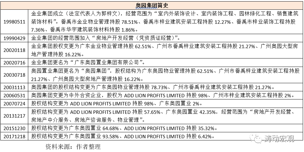 1、奧園集團有限公司成立于1998年5月(法定代表人為郭梓寧、位于廣州市番禹區、廣東奧園置業持股93.58%、ADD LION PROFITS LIMITED持股6.42%),最終實控人為郭梓文。