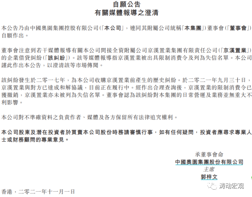 今年10月底,市場傳言奧園系子公司京漢置業因借貸糾紛成為失信執行人,引發中國奧園股債雙殺。雖然2021年11月1日,中國奧園發布公告澄清,但市場對奧園系的流動性擔憂依然存在。不過近期奧園正在謀劃出售京漢置業事宜。