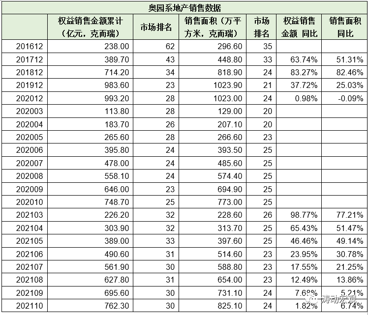今年前10個月,奧園地產的權益銷售金額和銷售面積分別為762.30億元和825.10萬平方米,同比分別增長1.82%和6.74%,數據上看還可以。不過奧園地產在全國地產行業中的排名這幾年一直處于上升態勢,從2016年的62名(按權益銷售金額)和35名(按銷售面積)提升至2019年的20名左右,但2020年以來奧園系的市場排名回落至30位左右。
