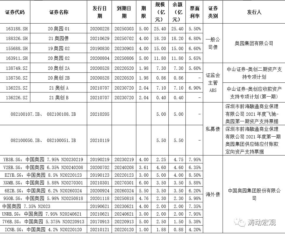 1、目前奧園系共有20只存量債券,分別為10只境內債券(余額合計達到96.56億元人民幣)和10只境外債(余額合計達到29.03億美元),前者由奧園集團有限公司為主體發行,后者則由中國奧園集團為主體發行。