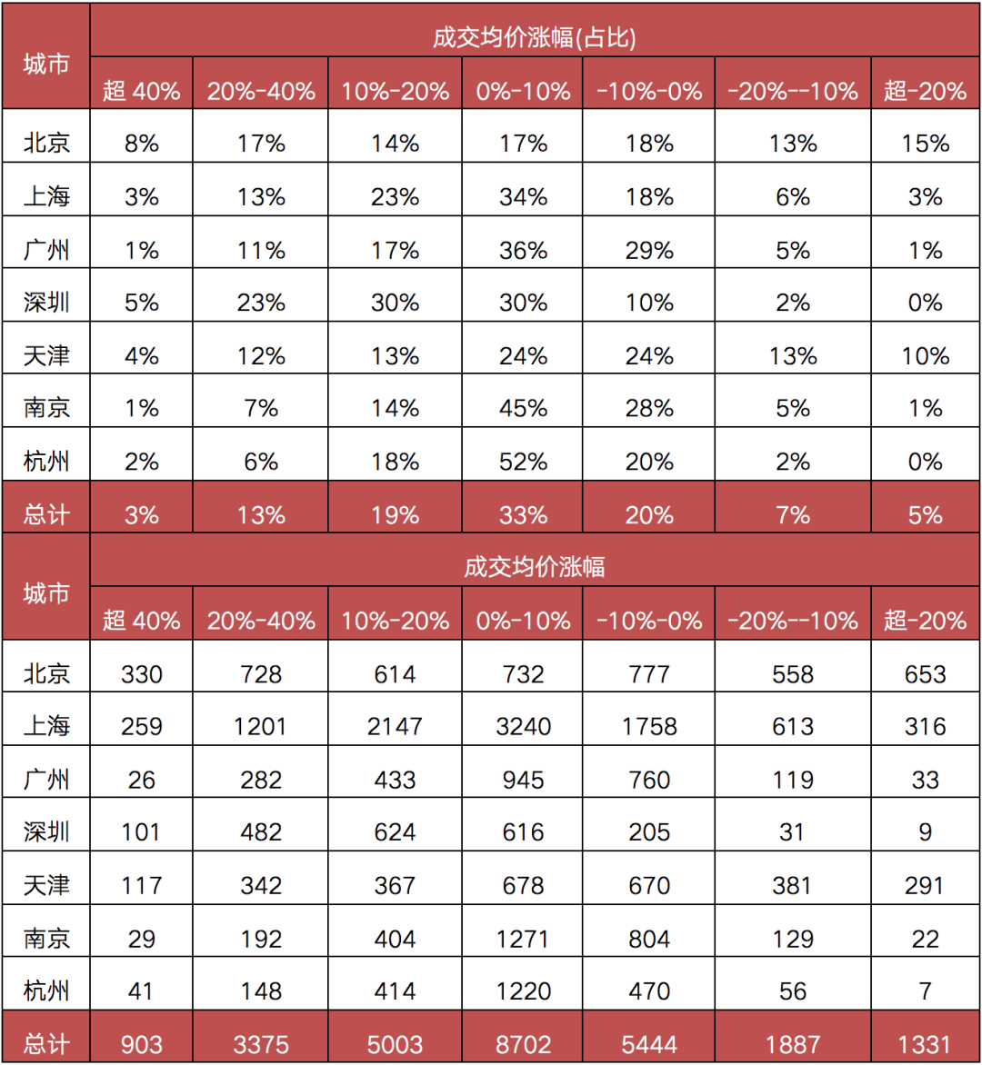 通過(guò)對(duì)熱點(diǎn)城市一、二手房在售項(xiàng)目可比價(jià)格變化情況定量分類(lèi)后,我們發(fā)現(xiàn)新房和二手房房?jī)r(jià)變化情況略有不同,部分小區(qū)成交均價(jià)漲幅動(dòng)輒超20%,而新房市場(chǎng)受價(jià)格指導(dǎo)政策影響,在售項(xiàng)目成交均價(jià)漲幅集中在10%以?xún)?nèi)。