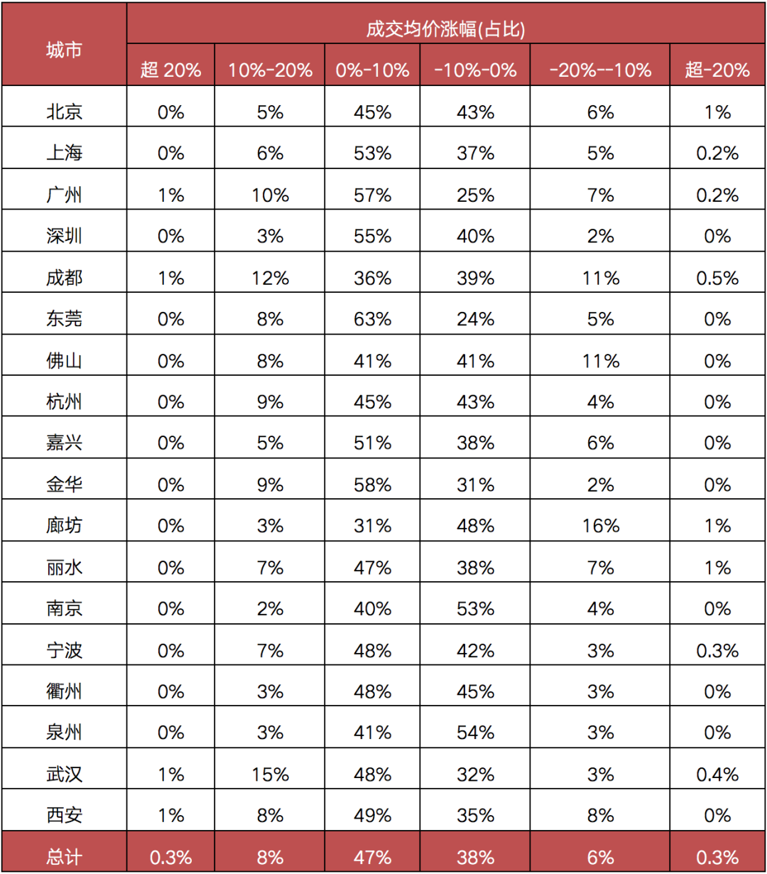 與此同時(shí),成交均價(jià)下跌的小區(qū)中,6成以上的小區(qū)跌幅不足10%。除北京、天津稍高外,上海、深圳、廣州等城市跌幅超10%的小區(qū)占比不足全市10%,因此市場(chǎng)直觀感受中在售項(xiàng)目罕有“跌勢(shì)”。