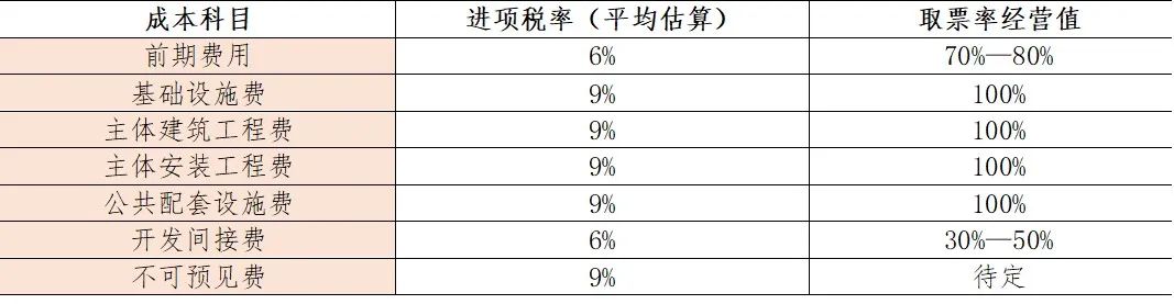 2)工程成本:對于工程成本來說,涉及到一個取票率問題,即支付某項工程成本時,可以取得的相應增值稅專票的比例,如取票率 60%,意味著每支付 1 億元成本,取得相應的增值稅專票的金額為 6000 萬元。