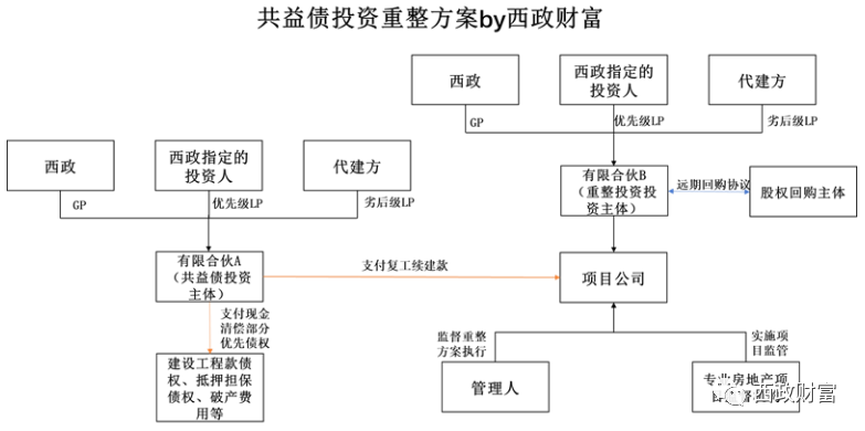 對(duì)于涉及到不良資產(chǎn)的項(xiàng)目,當(dāng)下不少開發(fā)商試圖介入其代建的相關(guān)業(yè)務(wù),同時(shí)要求其只負(fù)責(zé)代建,而不愿意出資。對(duì)于此類項(xiàng)目,出于風(fēng)控要求,我們通常會(huì)要求與代建方針對(duì)共益?zhèn)鶛?quán)投資部分與股權(quán)調(diào)整部分分別設(shè)立不同的主體(共益?zhèn)顿Y主體以及重整投資主體)對(duì)項(xiàng)目公司進(jìn)行投資,主要的盤活資金由共益?zhèn)鶛?quán)投資部分支付,用于收購(gòu)前期的抵押債權(quán)、支付欠付的工程款等;由于項(xiàng)目公司已資不抵債,股權(quán)價(jià)值為0,股權(quán)調(diào)整時(shí)通常由新設(shè)重整投資主體以較低的價(jià)格投入,并100%持股項(xiàng)目公司,并進(jìn)行風(fēng)控措施安排。其中,代建方作為劣后級(jí),出資比例在20%左右。更多內(nèi)容請(qǐng)參考本公眾號(hào)2022年3月2日的推文《回歸本源的AMC及爆雷房企的項(xiàng)目處置》。