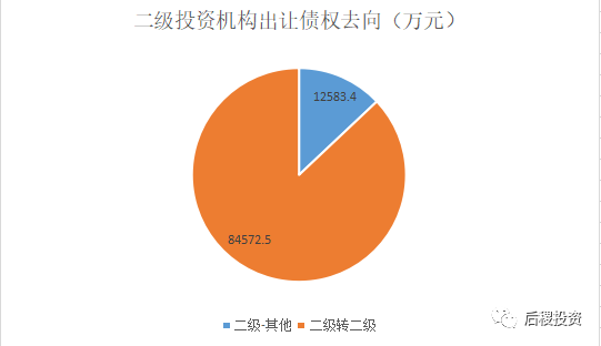 根據已有數據顯示,三級市場總成交159戶,總成交金額近10億元。2019年三級市場成交量與去年持平。二級投資機構之間的債權出讓在三級市場中占比84%。對比18年,二級投資機構之間的轉讓體量增加7億元;二級投資機構-其他減少3億元,未查詢到19年其他類出讓成交記錄。