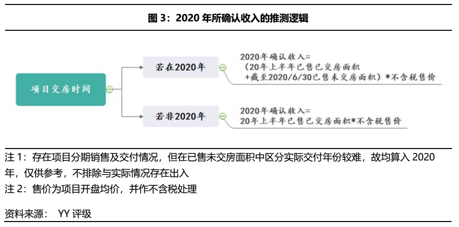 然后,我們通過公開渠道查詢這些項目的交房時間,根據下圖所示邏輯計算2020年確認/結轉的收入,并根據公司對這些項目的持股比例簡單區分是并表收入還是合聯營公司收入。