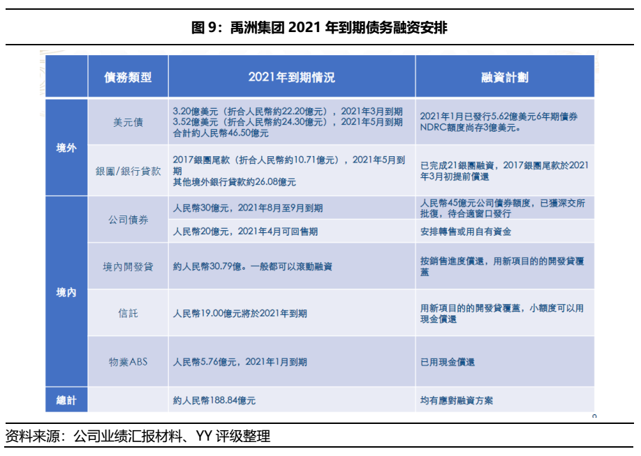 截至2020年末,禹洲集團有息債務總額639億元,其中短期占比約30%。三道紅線指標仍為僅觸碰一條,但正如我們在之前的報告中所揭示,公司合作開發比例較高,以及財務粉飾的動機使得非并表項目的負債具有一定風險敞口。