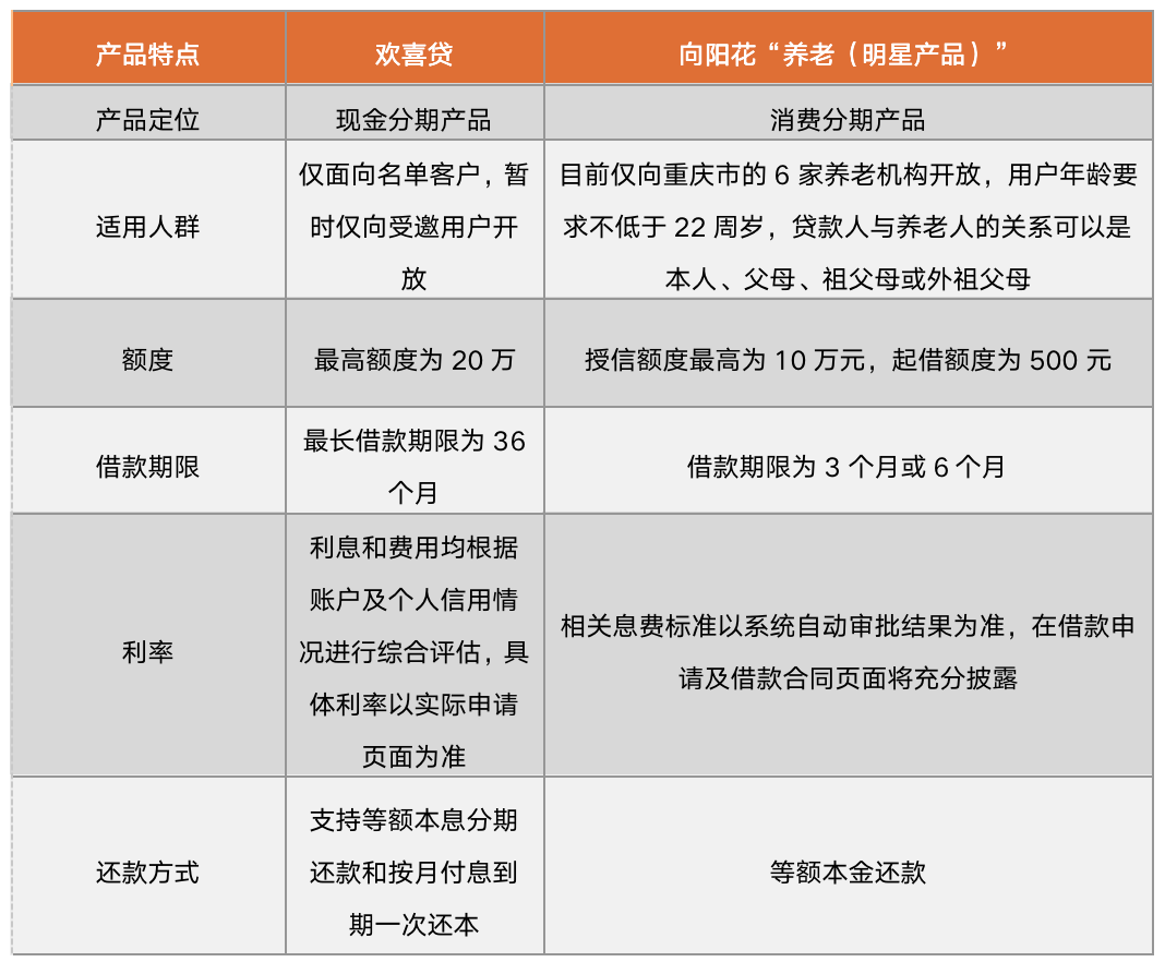 截至2021年11月,陽光消費金融僅有兩款產品:第一款是平臺開業初期便推出的現金分期產品“歡喜貸”;第二款是2021年5月推出的場景消費分期產品“向陽花”,該品類下還包括“養老(明星產品)”與“教育(高端晉升)”兩種產品。