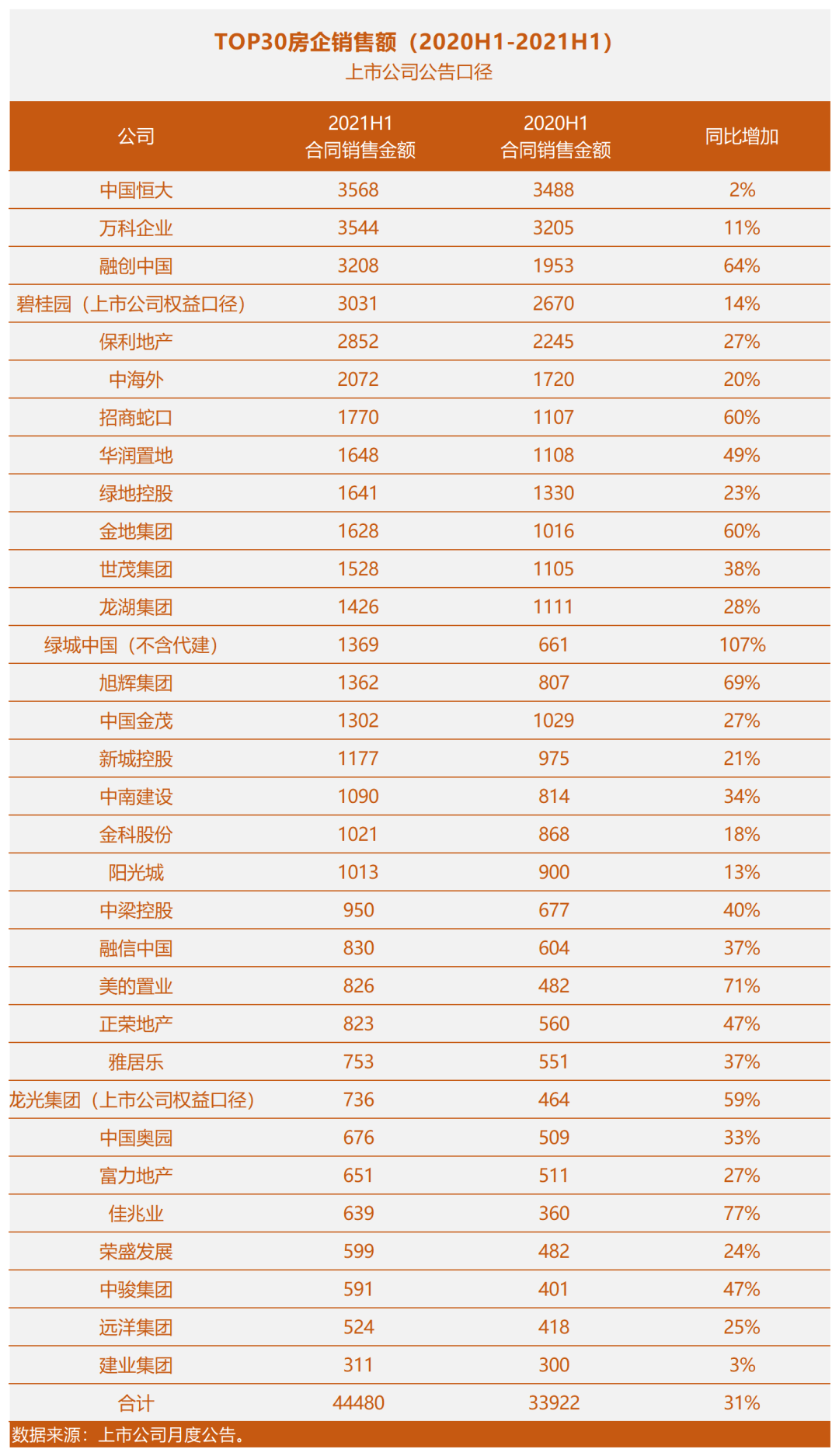 我們用上市房企月度公告口徑,對(duì)比了TOP30房企的銷售業(yè)績(jī)(2020年上半年與2021年上半年):