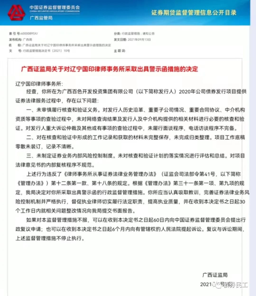 根據廣西證監局2021年9月13日披露的公開信息,遼寧國印律師事務所因為在廣西百色開發投資集團有限公司2020年公司債券發行項目中存在未審慎履行核查和驗證義務、未完整保存和歸類整理盡調底稿、未制定證券業務內部風險控制制度等問題,被廣西證監局采取出具警示函措施。根據公開信息,遼寧國印律師事務所為“20百投01”、“20百投02”和“20百投03”提供了證券法律法務。