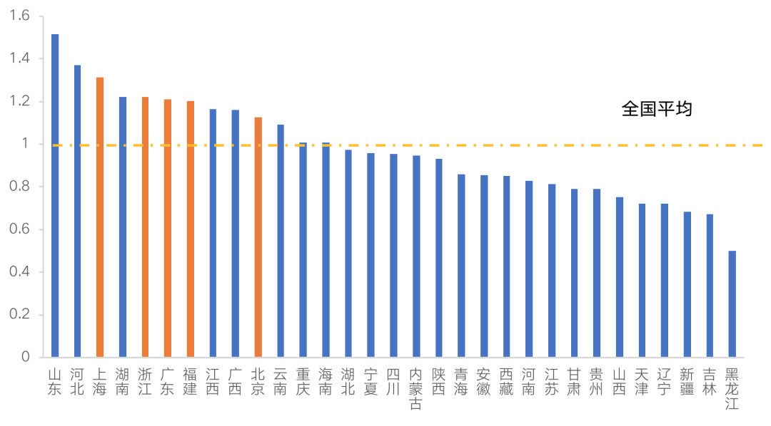 因此,為了進一步探知這些外來人口規(guī)模大的城市常住和戶籍人口的婚房需求差異,我們結合這些城市的常住人口出生量,并與初婚登記人數(shù)進行對比。以出生初婚人口比(常住出生人數(shù)/近兩年初婚登記對數(shù))指標來看,山東、河北、上海等13個省市的出生初婚比高于全國平均水平。