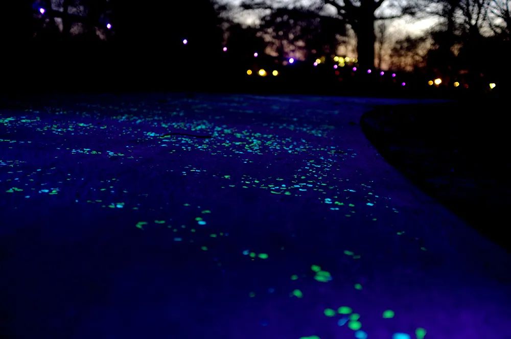 在路燈無法覆蓋的道路使用方面,埃因霍溫也做了很多嘗試,最著名的莫過于「梵高車道」。路面上鋪設的特制石子,能在白天吸收光能,并儲存能量;夜晚發光,為行人引路,形成一套自給自足的照明系統。