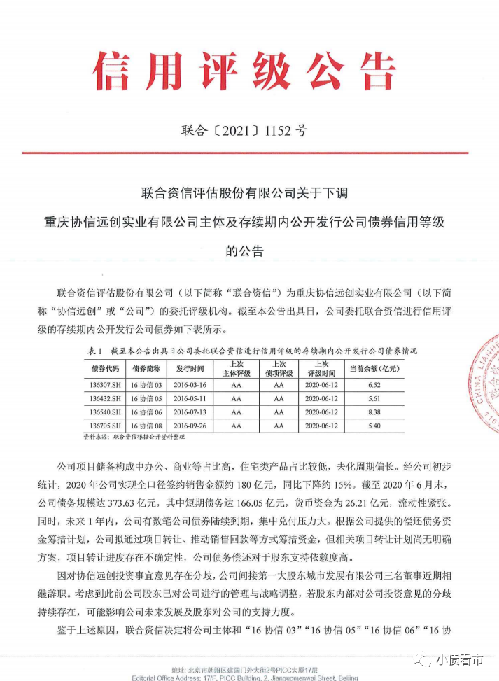 近日,聯(lián)合資信公告稱,將重慶協(xié)信遠創(chuàng)實業(yè)有限公司(以下簡稱“協(xié)信遠創(chuàng)”)主體和“16協(xié)信03”、“16協(xié)信05”、“16協(xié)信06”、“16協(xié)信08”信用等級下調至AA-,并將其列入可能下調信用等級的評級觀察名單。