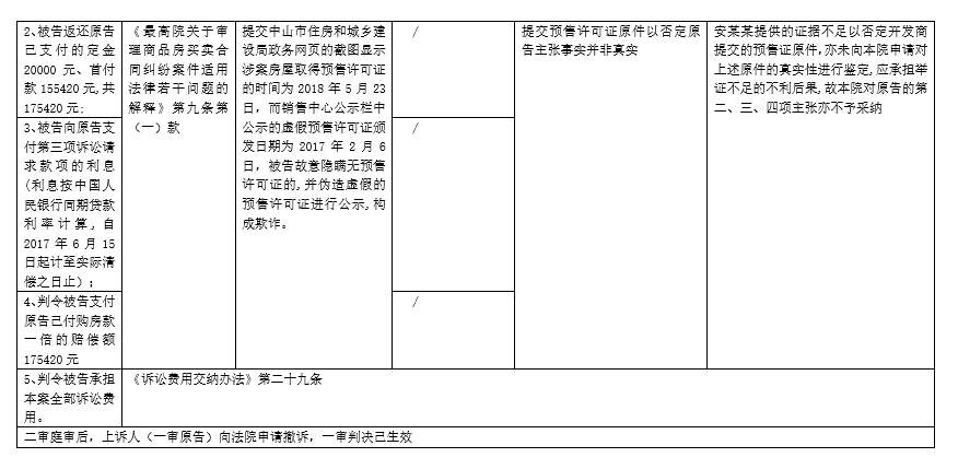 案情背景:原告安某向被告開發商認購一套商品房,分別于2017年6月8日、6月15日簽訂《認購書》、《中山市商品房買賣合同》,約定開發商將位于中山市西區某幢1001房(以下簡稱案涉商品房)出售給原告,原告于2017年6月8日、6月15日分別向被告交付定金20000元、首付款155420元,共176150元至指定被告賬戶。2018年3月1日,原告委托律師向被告發出律師溝通函,要求解除雙方簽訂的認購書及商品房買賣合同,要求開發商退還定金和購房款。被告不同意,業主遂向法院起訴。原告對自己提出的訴訟請求所依據的事實,以及被告反駁原告訴訟請求所依據的事實,以及法官根據法律規范(法律法規及相關司法解釋)及證據規則,在自由心證的基礎上認定如下表: