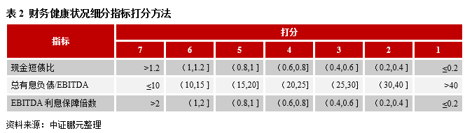 本小節將著重介紹下城投公司違約路徑預測模型的各項細分指標的取值標準、所占權重(見表1),以及具體的打分方法。在此之前,需要做一個重要提示和聲明:本文所構建的城投公司違約路徑預測模型不完全同于城投公司信用評級模型,并不是要通過城投行業的信用評級方法來評估城投公司的信用資質,因此文中所涉及的指標選取、權重設置、打分依據等均與評級機構的城投行業評級方法無關。具體來看,預測城投違約路徑和評估城投公司信用資質的區別在于:前者的目的和側重點是找出哪些城投公司是更危險的(本質是探究其會不會出事,針對的是最壞結果,類似于買西瓜時千萬不要買到生瓜),后者的目的和側重點是找出哪些是更安全的(本質是探究其可投資價值的大小,針對的是最大利益,類似于買西瓜時要買最沙甜的瓜)。鑒于此,本文在構建模型時,更多采用的是底線思維,也就是說以規避掉最差最危險的為目標,而不是以篩選出最好最安全的為目標,這也是違約路徑預測模型摒棄掉凈資產、營業收入等規模類指標而著重考察償債能力相關指標的根本原因。