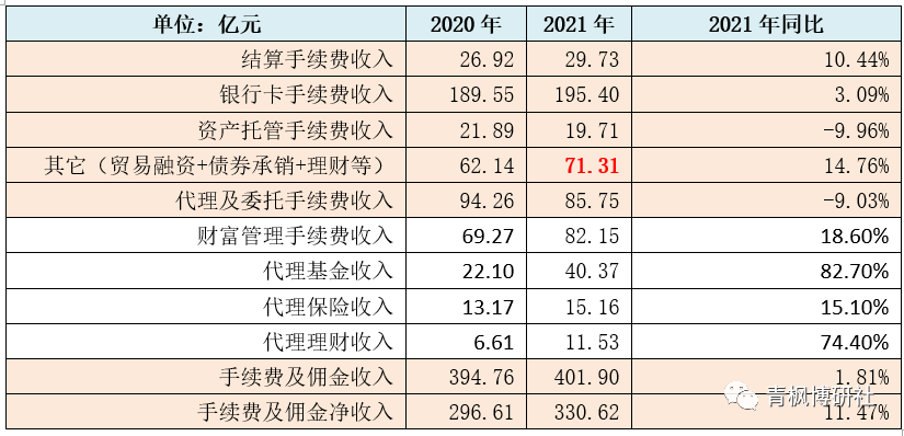 2021年,平安銀行實現中間業務凈收入達到330.62億元,同比增長11.50%,占全部營收的比例進一步提升至19.52%。其中,大財富管理業務貢獻較大,