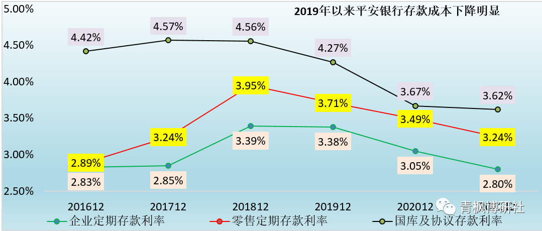 1、今年,平安銀行的企業定期存款利率下降25BP(較2019年累計下降58BP)、零售定期存款利率下降25BP(較2018年累計下降71BP)、國庫及協議存款利率下降5BP(較2018年累計下降94BP)。