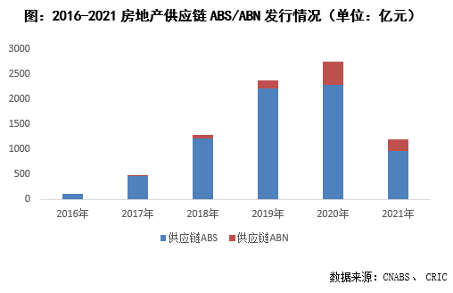 近幾年隨著房地產(chǎn)融資渠道如銀行信貸、私募資管計劃、委托貸款、銀信合作和海外債等的步步收緊,供應(yīng)鏈融資越來越成為企業(yè)補充資金來源的重要方式,特別是三條紅線以來,該方式可以有效幫助房企降低有息債杠桿。從2018年開始房地產(chǎn)供應(yīng)鏈ABS/ABN發(fā)行呈井噴式增長,2020年發(fā)行量達到2753億元,較2016年五年復(fù)合增長率達到126%。