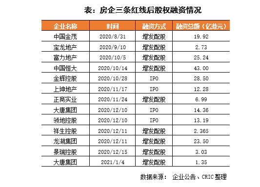 除了在供應(yīng)鏈金融方面的逐步嚴控收緊,三條紅線后,監(jiān)管在股權(quán)融資、信用債等方面也加強監(jiān)管,加大對房企融資的限制。在股權(quán)融資方面,2021年至今沒有企業(yè)上市成功,且當(dāng)前上市招股書在有效期的僅有三巽控股、天泰控股、新星宇控股這3家企業(yè)。與此同時,非IPO股權(quán)融資發(fā)行審核更嚴,2021年里僅有大唐控股發(fā)行1.35億港元的增發(fā)配股,但這是基于其2020年底上市IPO成功后行使的超額配股權(quán),除此之外再無企業(yè)實現(xiàn)股權(quán)再融資發(fā)行。