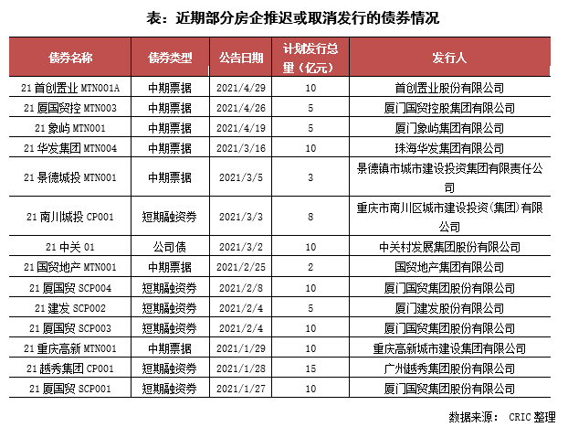 與此同時,2020年以來企業(yè)信用債暴雷頻發(fā),且逐步波及到排名較前的中大型房企,從而引發(fā)債券市場動蕩。截止2021年5月26日,房企債券違約金額約達296.78億元,較2020年增長56%,在此情況下,疊加融資收緊的政策壓力,債券市場近期較為動蕩,首創(chuàng)、廈門國貿(mào)等近期取消了多筆中期票據(jù)以及融資券的發(fā)行,企業(yè)信用債融資也受到較大的影響。而海外融資受近期境內(nèi)債違約、美元上調(diào)、海外疫情等多重因素的影響,房企境外發(fā)債較少,截止4月底的發(fā)行量占總債券的48%,比2020年同期低潮期還低2個百分點。