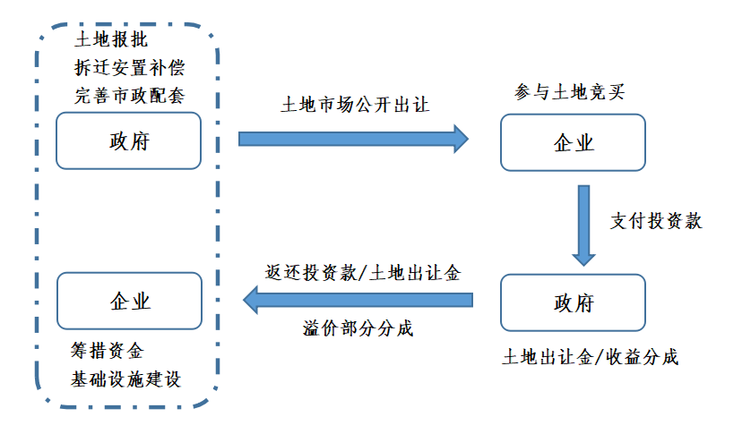 政府主要負責土地報批、拆遷、安置補償、完善市政配套等,而企業籌措資金和參與基礎設施建設的角色
