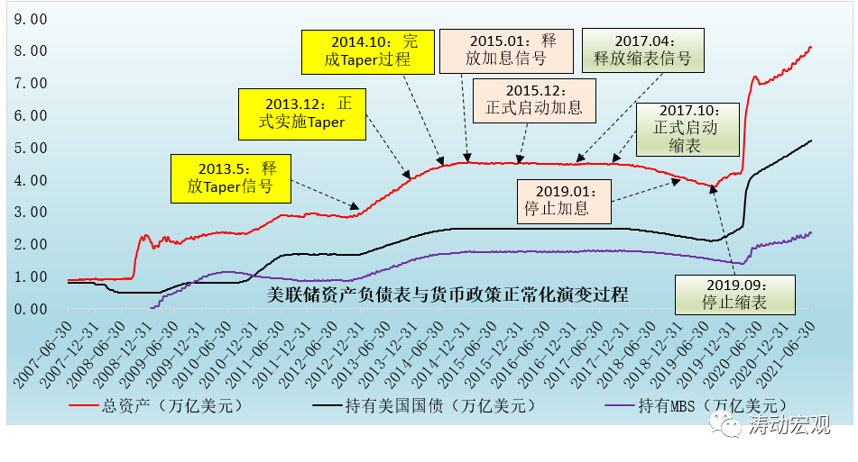 前面已經(jīng)指出,美聯(lián)儲(chǔ)的貨幣政策正常化路徑基本上遵循“向市場(chǎng)釋放Taper信號(hào)——Taper過程——向市場(chǎng)釋放加息信號(hào)——加息——向市場(chǎng)釋放縮表信號(hào)——正式縮表”的邏輯脈絡(luò)。