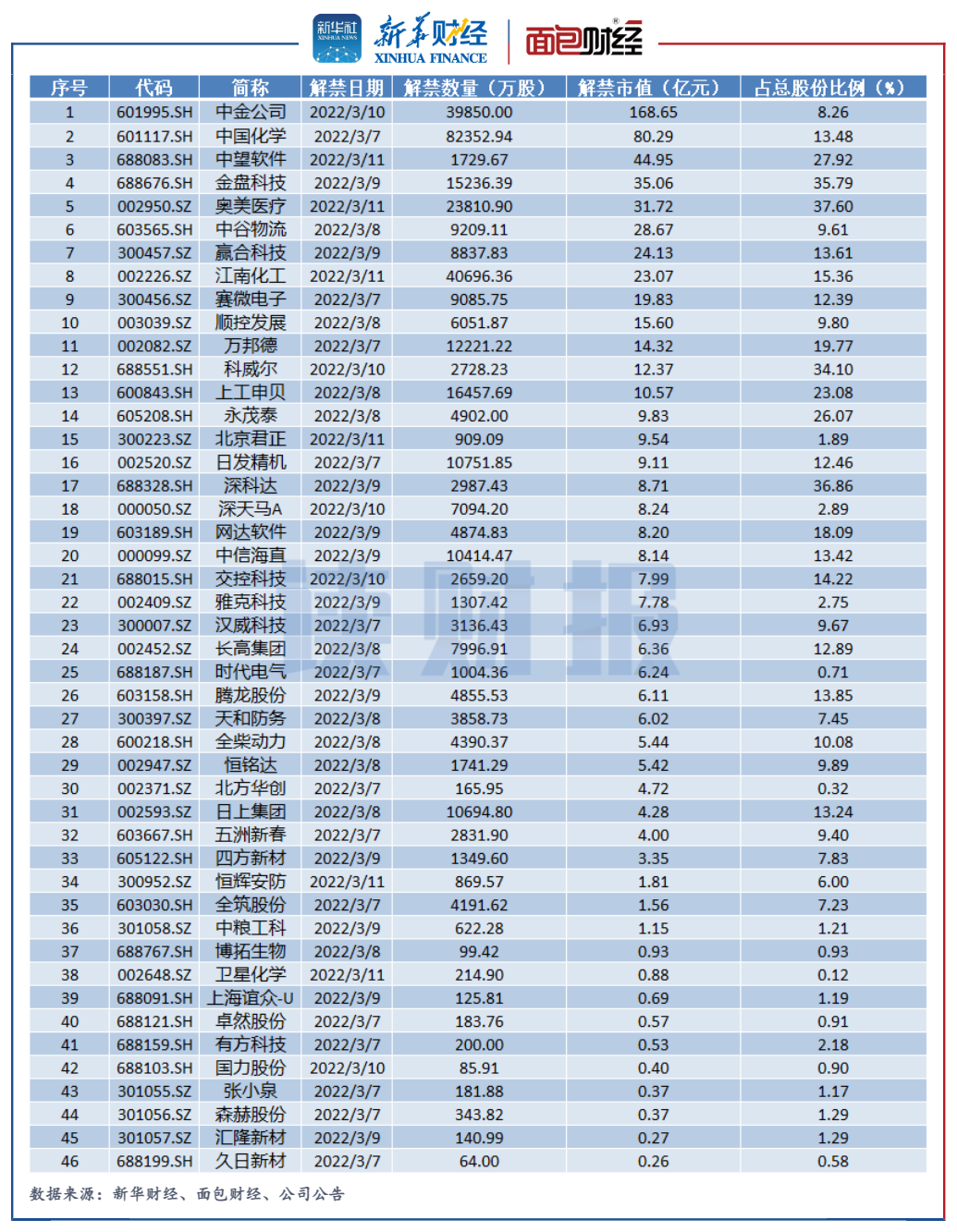 圖1:2022年3月7日至3月11日解禁個(gè)股