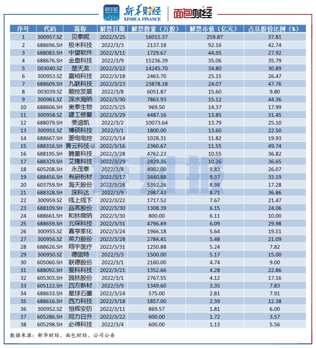 此外,共有38家公司于3月迎上市周年解禁,合計(jì)解禁量約為16.29億股,解禁市值約為757億元。