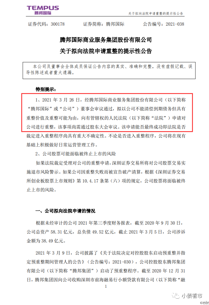 3月27日,騰邦國際(300178.SZ)公告稱,經公司董事會審議通過,擬以公司不能清償到期債務但具有重整價值及重整可能為由,向有管轄權的人民法院申請對公司進行重整,該事項尚需通過股東大會審議。