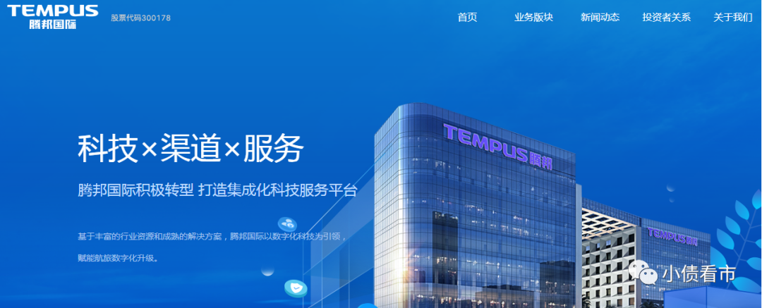 據官網介紹,騰邦國際是“中國商業服務第一股”,中國旅游行業的龍頭企業,業務涵蓋旅游度假、航空運營、商旅管理、金融服務四大板塊。