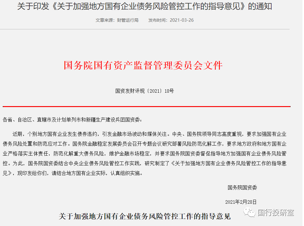 2021年3月26日,國資委官網(wǎng)正式公布《關(guān)于加強(qiáng)地方國有企業(yè)債務(wù)風(fēng)險(xiǎn)管控工作的指導(dǎo)意見》(以下簡稱18號(hào)文)。18號(hào)文的簽發(fā)時(shí)間為2021年2月28日,實(shí)際上已于近日下發(fā)給各地方國資委。