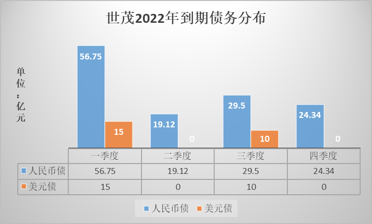 根據(jù)公開資料顯示,世茂2022年到期的公開市場債務(wù)合計約為130億人民幣與25億美元。其中一季度則是全年之中到期債務(wù)的高峰。