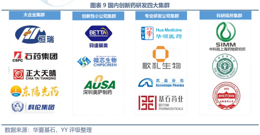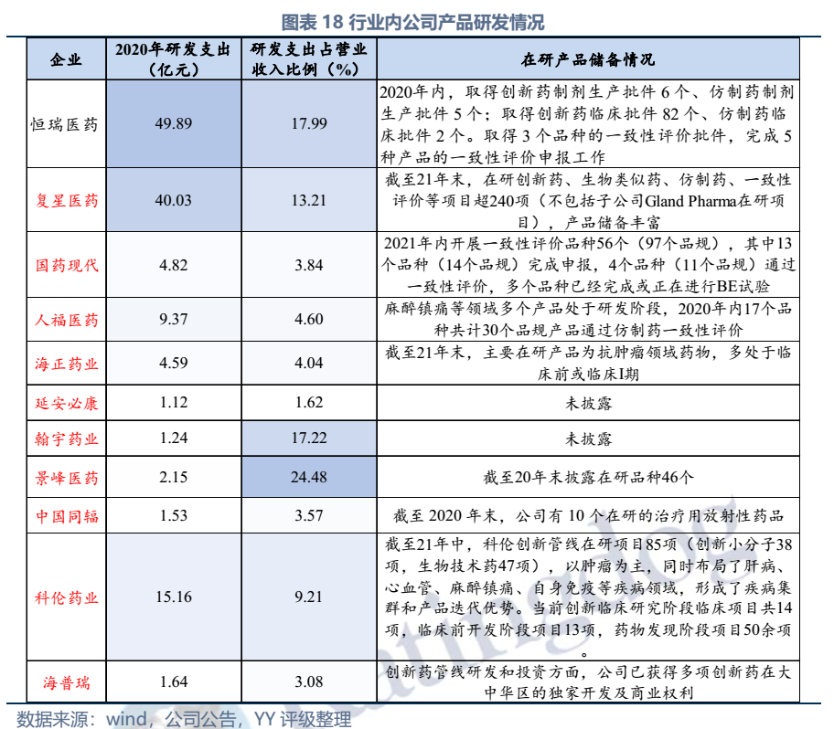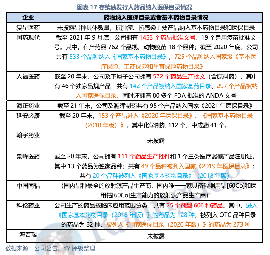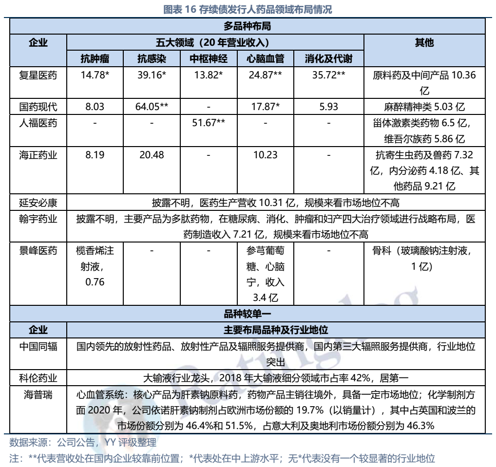 目前國內醫藥市場仍主要以包括化學藥劑和生物藥在內的西藥為主導,且大部分以仿制藥為主。創新藥研發方面主要形成四大集群,不過整體在債市的存在感不高。競爭格局方面,抗腫瘤、抗感染、心血管、中樞神經以及消化代謝系統領域占藥品市場規模60%以上,各領域企業眾多,具備一定市場地位的公司多為上市公司,如抗腫瘤領域主要有恒瑞醫藥、綠葉制藥、石藥集團、泰森制藥,抗感染領域主要有正大天晴、國藥現代、華北制藥、復星醫藥、海正藥業。