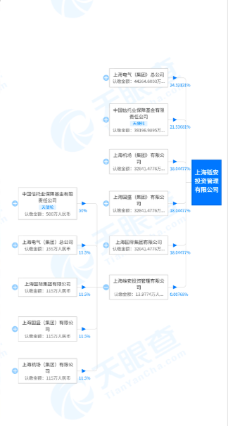 而翻開上海維安投資管理有限公司,注冊資本為1000萬人民幣;控股股東為信?;穑止杀壤秊?0%,剩下的四家國企均分剩下的股權。