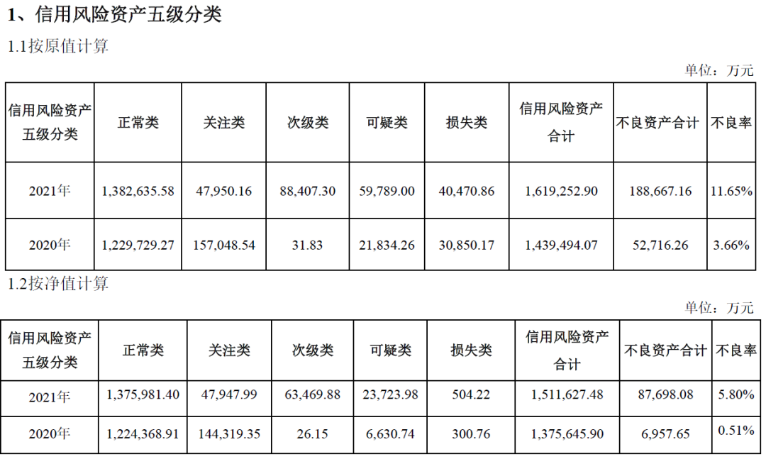 2.在信用風險資產的五級分類中,陜國投報告期內的不良資產合計18.86億元,不良率為11.65%,去年的這一數據為5.27億元和3.66%。上述數據是按原值計算,如果按照凈值計算,2021年不良資產為8.77億元,不良率為5.80%;2020年這一數據僅為0.70億元和0.51%。