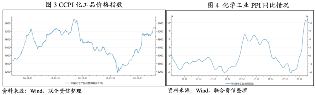 2021年上半年,隨著全球范圍疫情控制及恢復生產(chǎn),對化工品需求的增加支撐了化工品價格上漲。截至2021年6月底,化工產(chǎn)品價格指數(shù)(CCPI)達到5100點附近,處于近年相對高位。同期,化學工業(yè)PPI同比大幅增長,超過2017和2018年的最大同比增幅。