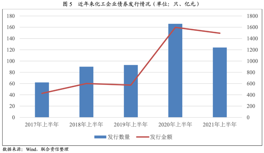 2021年上半年,疫情對中國經(jīng)濟的影響逐漸消退,中國穩(wěn)健的貨幣政策在保持流動性合理充裕的同時,強化了對實體經(jīng)濟、重點領域以及薄弱環(huán)節(jié)的支持。具體到信用債方面,2021年上半年,化工企業(yè)信用債的發(fā)行規(guī)模同比有所下降,但仍處于近五年相對高位。通過對申萬化工分類數(shù)據(jù)整理,截至2021年6月底,化工企業(yè)發(fā)行各類信用債券(全部市場,含可轉(zhuǎn)債和私募債,下同)124只,同比減少42只;發(fā)行規(guī)模1494.40億元,較上年同期下降6.46%,從發(fā)行量到發(fā)行規(guī)模同比均有所下降,但均已超過新冠肺炎疫情爆發(fā)前水平。其中,發(fā)行量較2017年同期增加62只,發(fā)行金額較2017年同期大幅增長251.46%,化工行業(yè)信用債融資熱情較高。