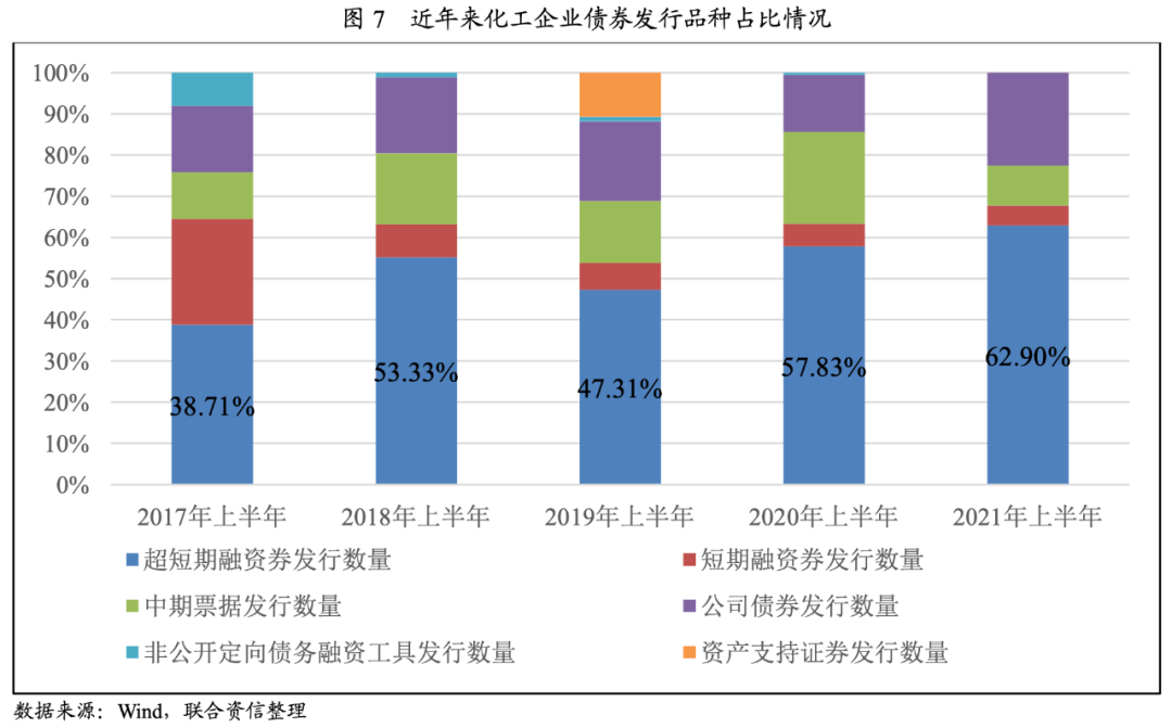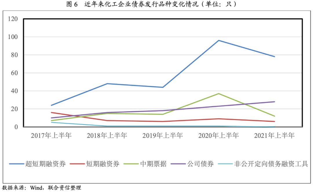從發(fā)行品種來看,2021年上半年,化工企業(yè)發(fā)行信用債券中,超短期融資券同比減少18只,但仍為第一大品種,共計發(fā)行78只,占62.90%。公司債券發(fā)行量居第二位,共計發(fā)行28只,同比增加5只,占22.58%。其余為中期票據(jù)和短期融資券,分別發(fā)行12只和6只。2017年以來,超短期融資券均為化工行業(yè)上半年債券發(fā)行的第一大品種,且2021年占比達近年來高位;公司債券發(fā)行量近年來逐年增長,2021年上半年發(fā)行量占比首次超過20%。